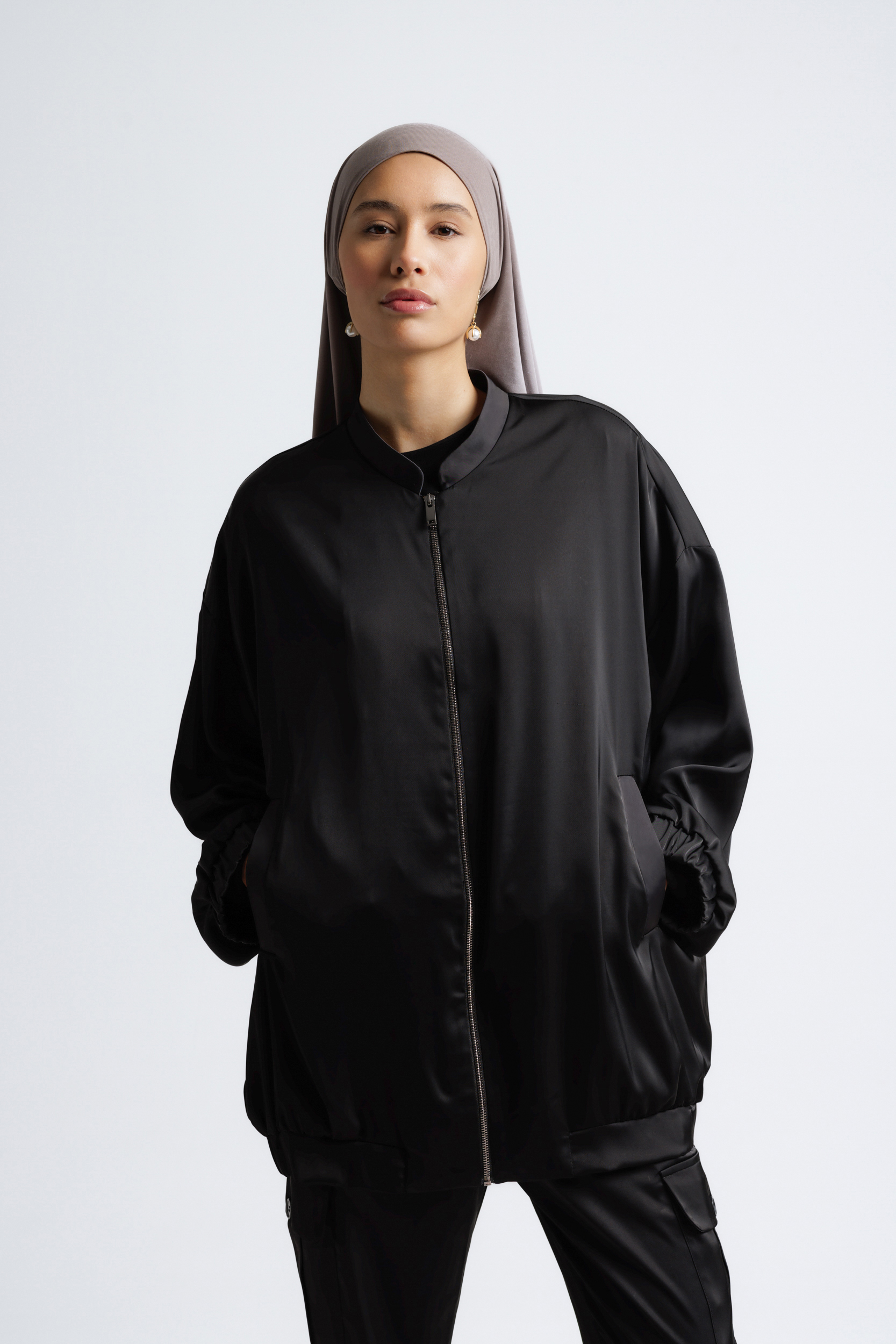 Black oversized bomber jacket crafted from luxurious satin, offering a unique combination of comfort and style.