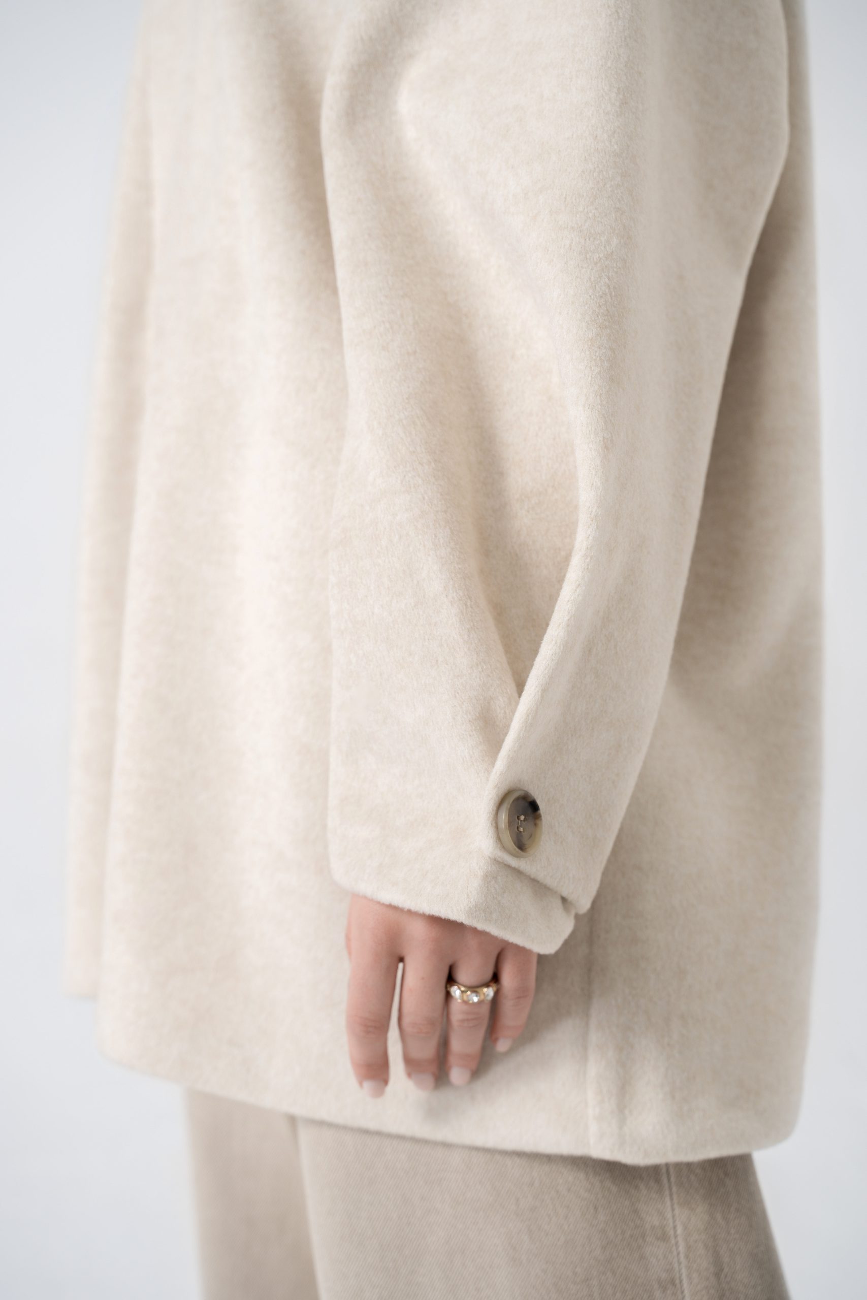 Details: Elegant sleeve pleats with decorative buttons